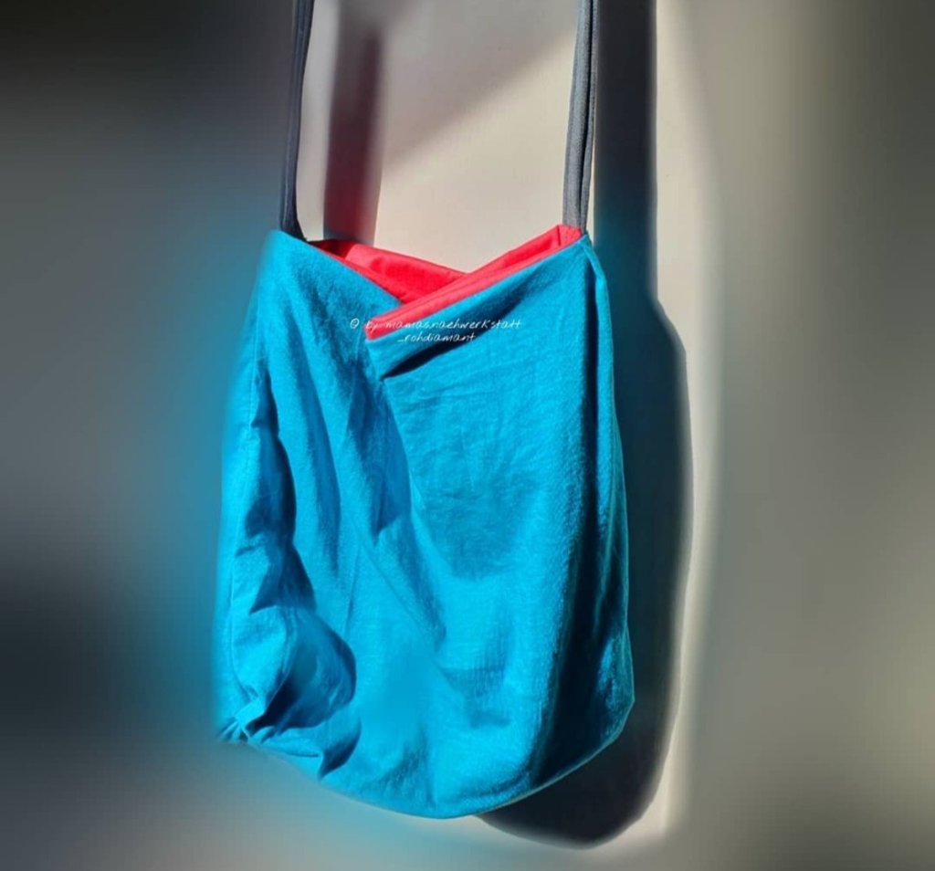 Im Internet hatte ich mir eine Anleitung gesucht, wie Tragetaschen schnell und einfach genäht werden. Den Stoff (außen wie innen) habe ich mit den Maßen 40x40cm zugeschnitten und den Träger 70x15cm.