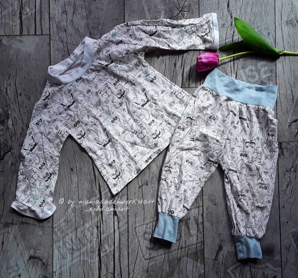 Ich finde diese süßen Handmade Sachen einfach so schön, dass ich auch zu Beginn schon das Bedürfnis hatte, ganze Sets für den Nachwuchs zu nähen. Auch dieses gehört zu den vollkommen unperfekten Anfängen und war das erste Set, das ich genäht habe. Den Pullover hatte ich schon früher genäht und die Hose erst im Verlauf meiner Näherei, um das Langarmshirt perfekt ergänzen zu können.Ein weiteres Set, das aus meinen Anfängen stammt. Ich mag den Stoff wahnsinnig gern. 😍 Meine Tochter liebte Winnie Pooh, als sie noch ganz klein war. Da schien mir das Material einfach absolut perfekt zu sein.Mein drittes Beginner-Set ist aus einem Jerseystoff genäht, der sich superweich anfühlt.